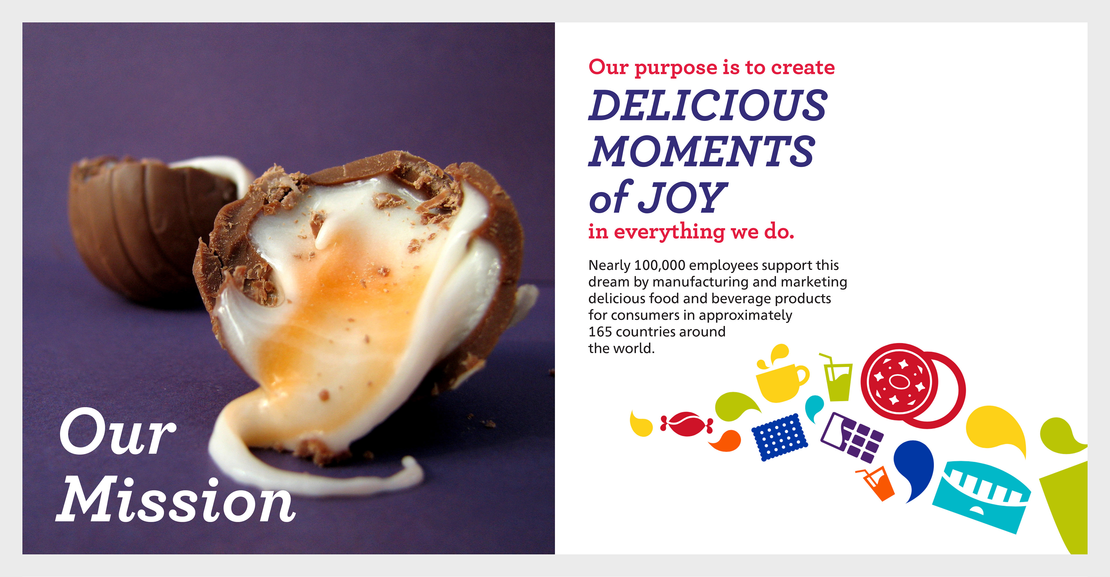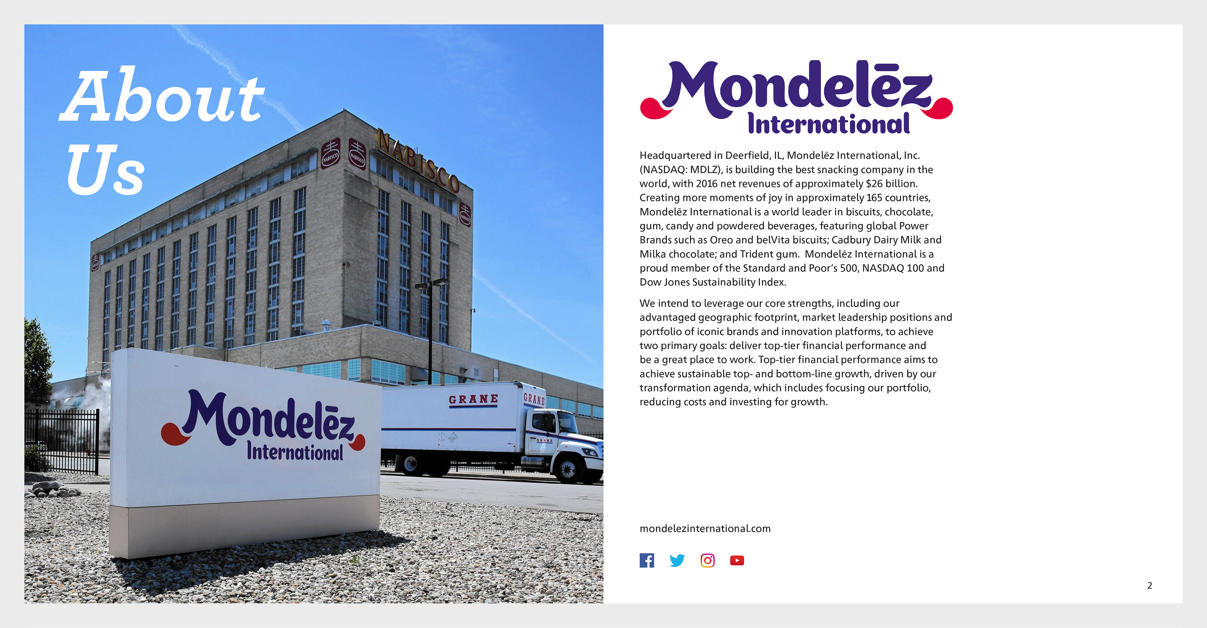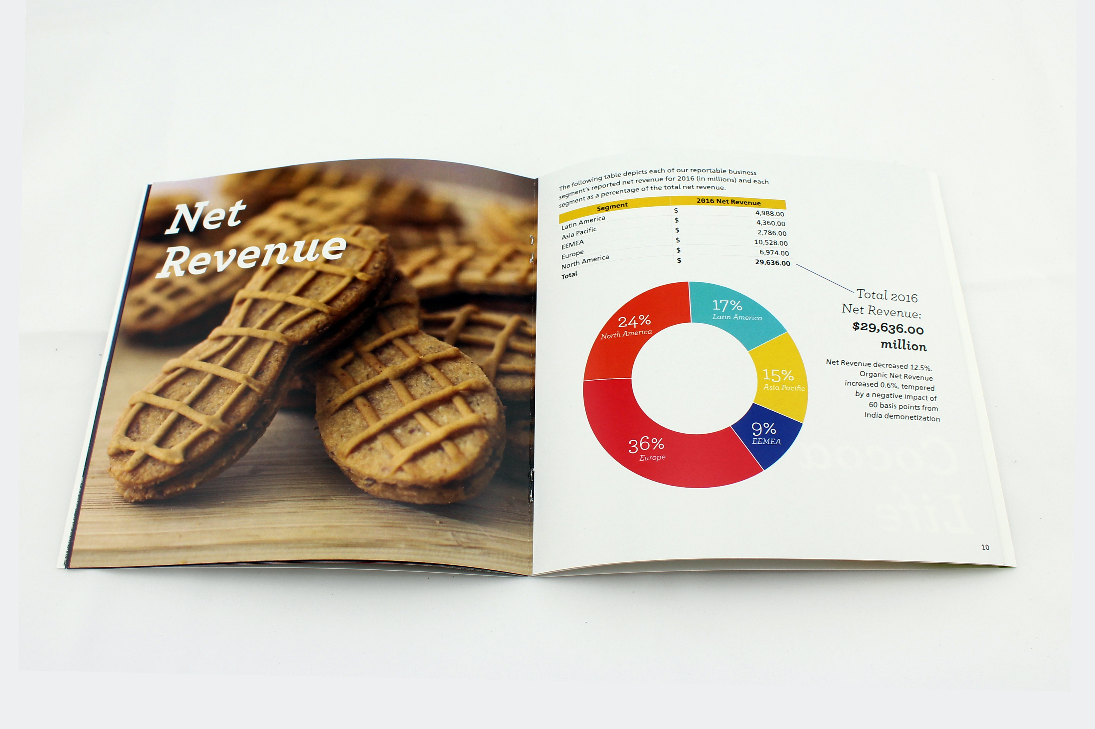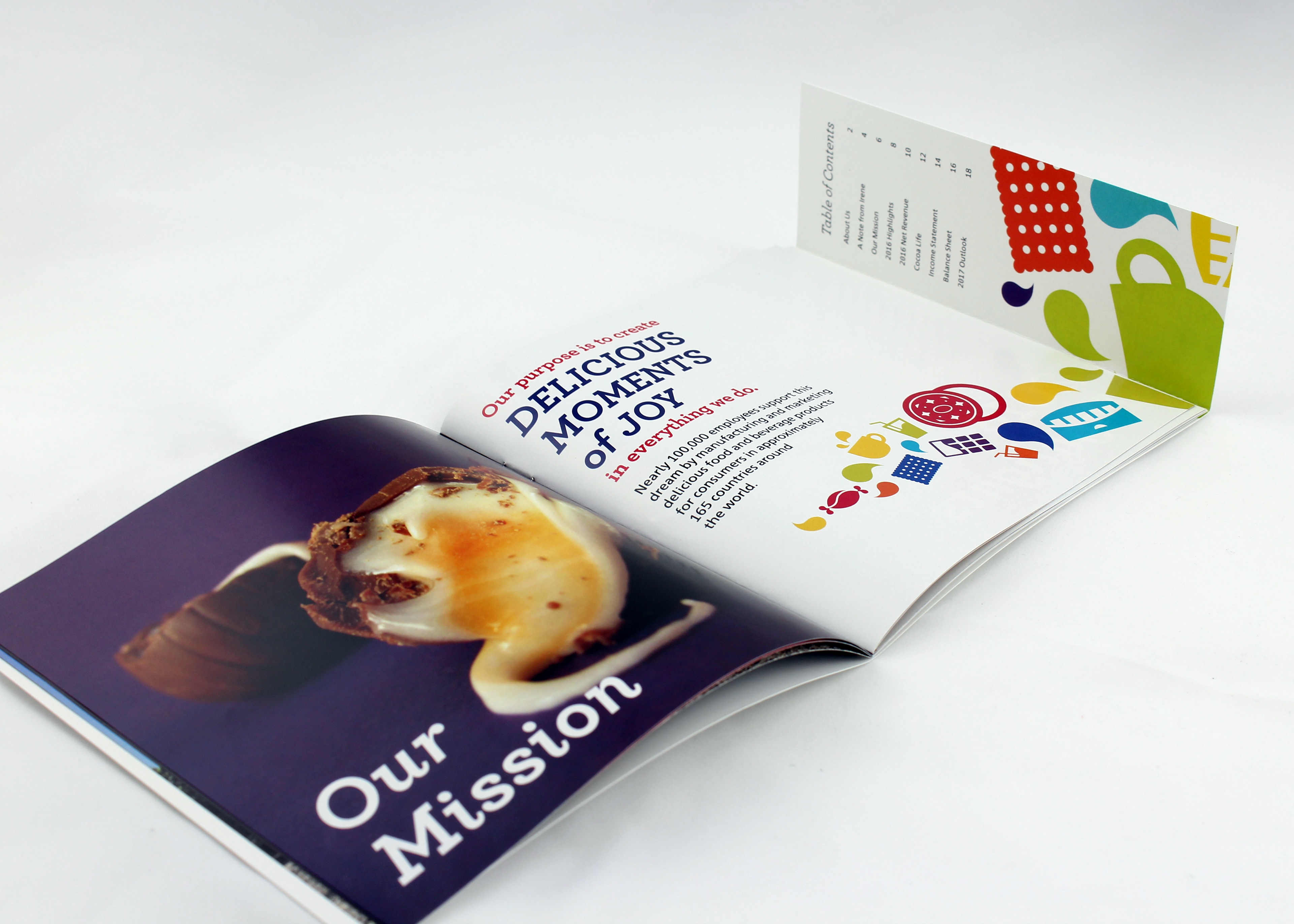 Spreads for a 6×6 inch Annual Report booklet designed with a die cut cover and fold-out table of contents for the snacking company Mondelēz International.