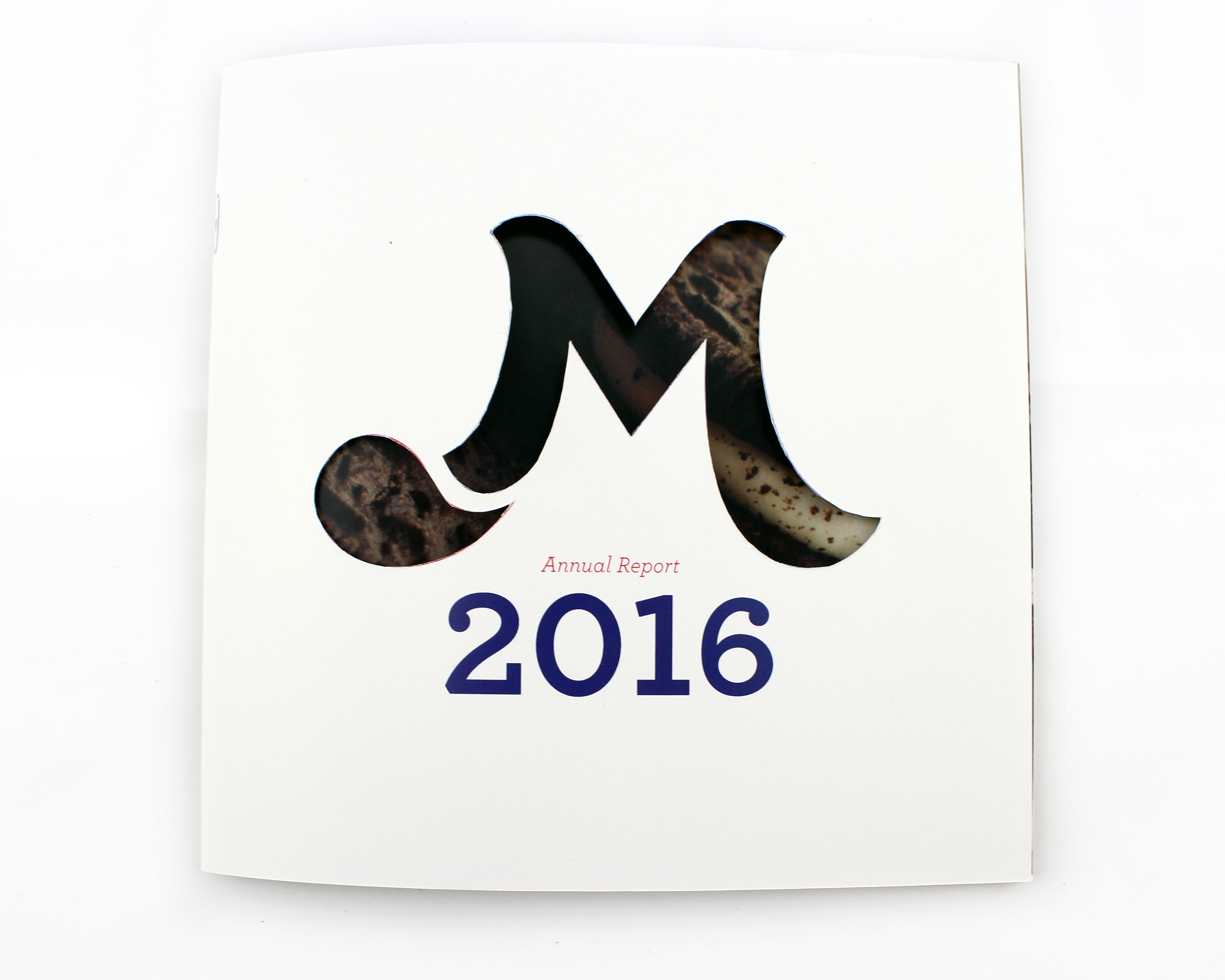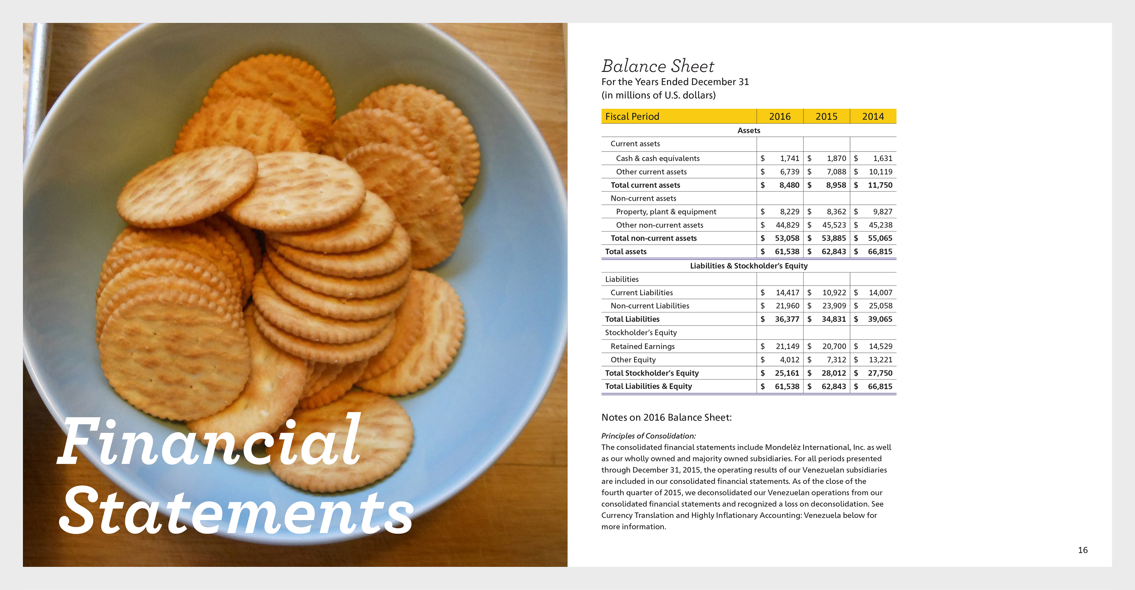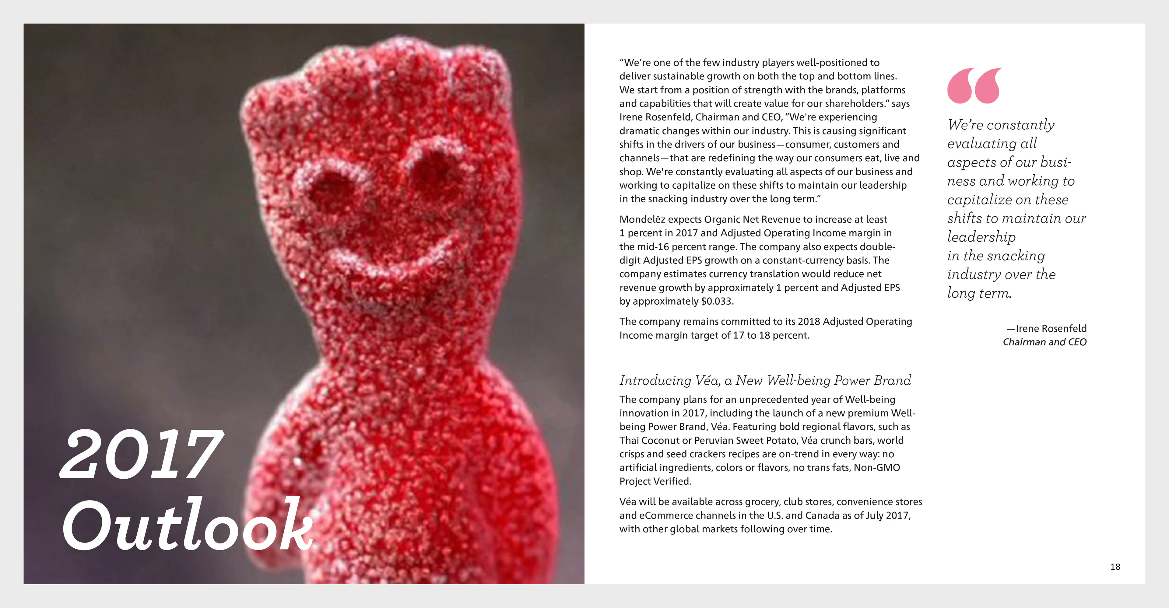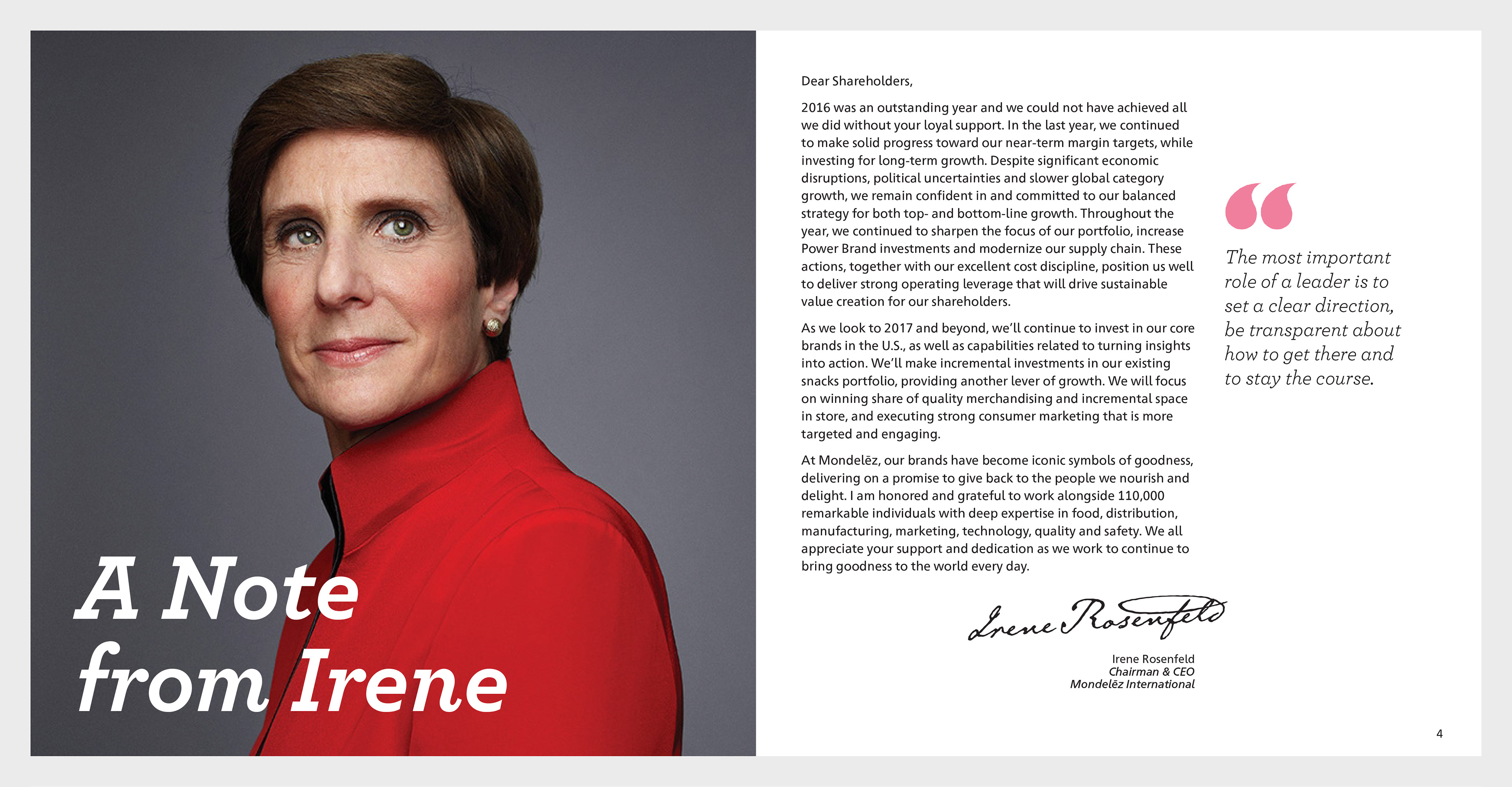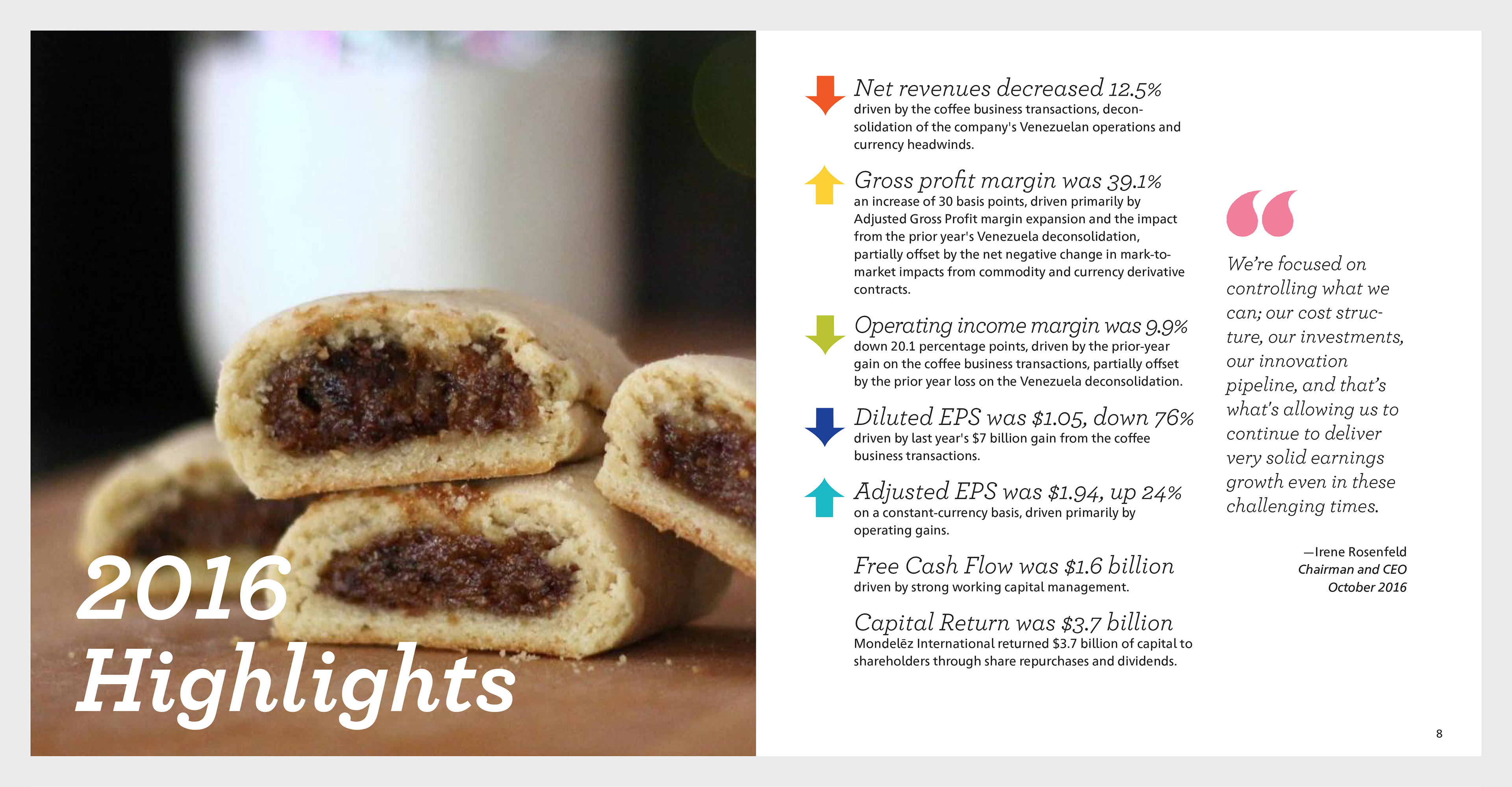 Spreads for a 6×6 inch Annual Report booklet designed with a die cut cover and fold-out table of contents for the snacking company Mondelēz International.