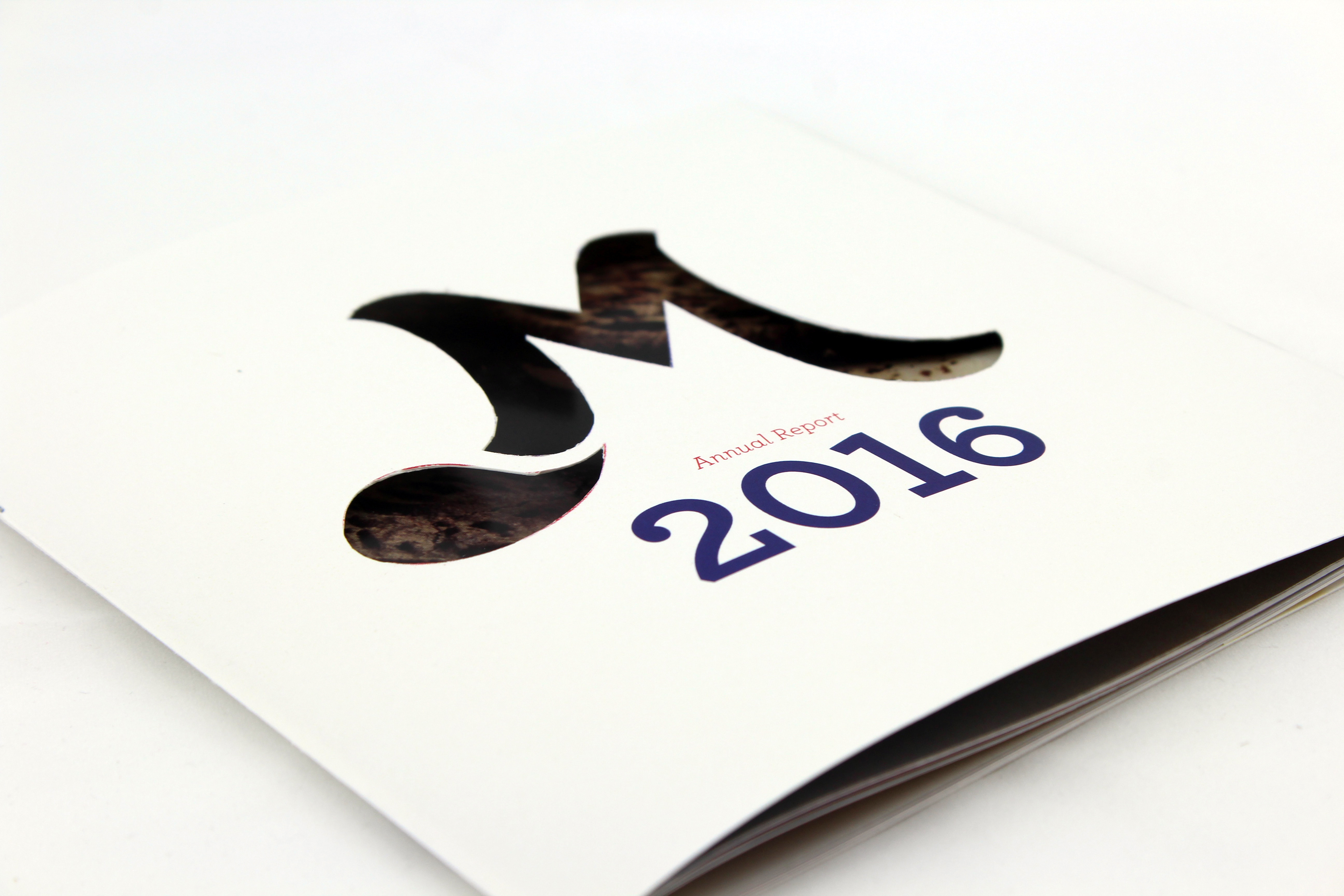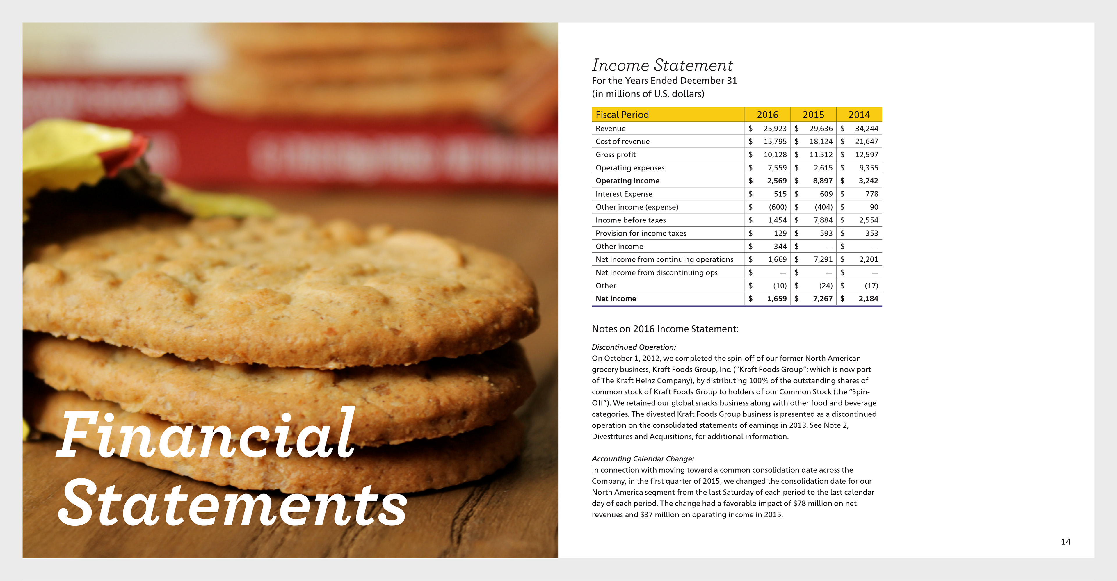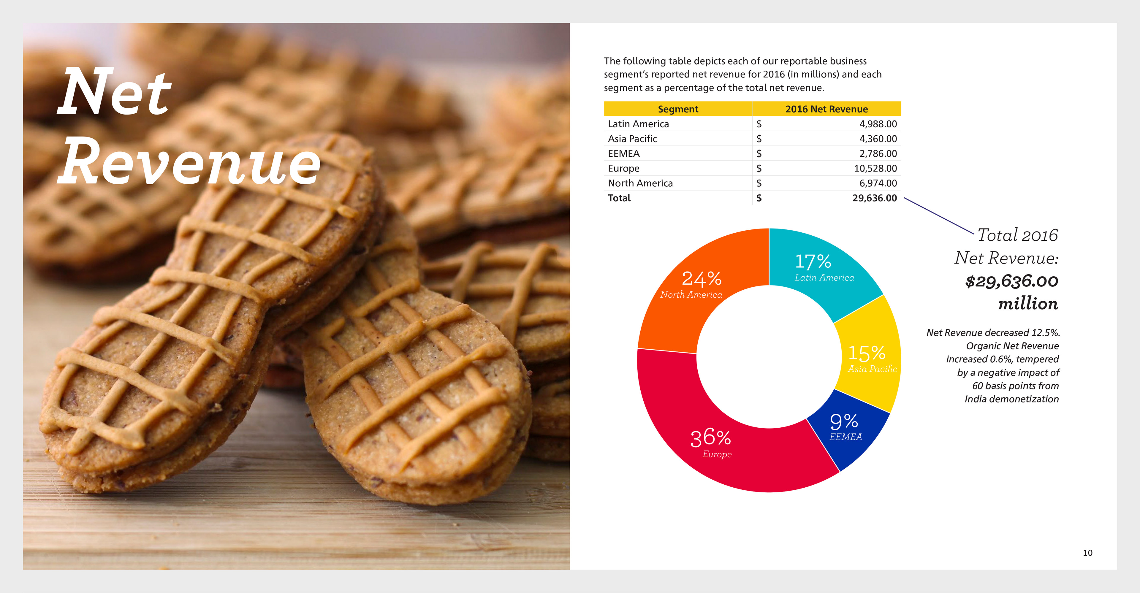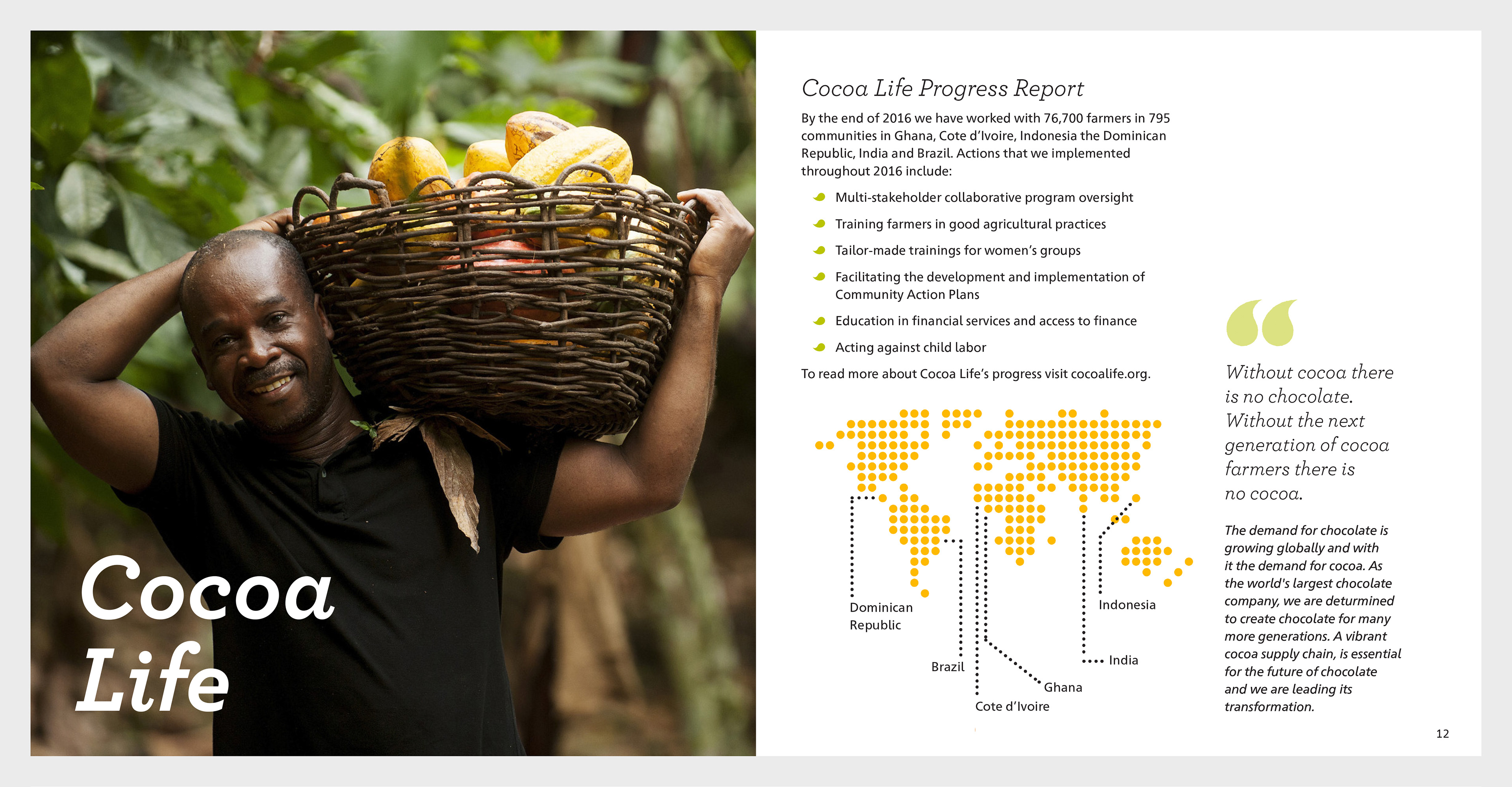 Spreads for a 6×6 inch Annual Report booklet designed with a die cut cover and fold-out table of contents for the snacking company Mondelēz International.